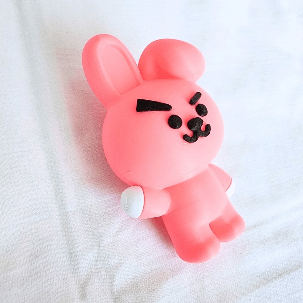 BTS karakterlerinden Cooky figürü, 3D yazıcı teknolojisi ile üretilmiş olup pembe rengiyle dikkat çeken sevimli bir tasarıma sahiptir. BTS hayranları için özel olarak tasarlanan bu figür; masa, raf ve vitrin dekorasyonu için idealdir. Hafif ve dayanıklı yapısı sayesinde uzun süreli kullanım sunar.