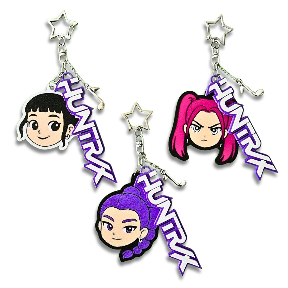 K-Pop tutkunları için özel olarak tasarlanan Demon Hunters Huntrix karakterleri temalı anahtarlık seti ile tarzınızı yansıtın! 🎧✨